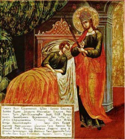 Однажды этот благочестивый клирик заболел опасной и мучительной болезнью: у него начал гнить язык, и боль была настолько сильна, что он терял рассудок. Придя в себя, больной в уме прочитал свою обыкновенную молитву к Богоматери и тотчас у своего изголовья увидел стоящего прекрасного юношу. Больной понял, что этот гость есть ангел-хранитель. Взирая с состраданием на больного, ангел воззвал к Пресвятой Богородице, вознося Ей моление об исцелении. Вдруг явилась Сама Божия Матерь и, умилосердившись над болящим страдальцем, явила знамение Своей великой любви. Больной сразу почувствовал себя совершенно здоровым и пошел в церковь. Став на клиросе с поющими, он принял участие в церковном пении, приведя в изумление народ. Это великое чудо подало повод к изображению Богоматери «Целительницы».