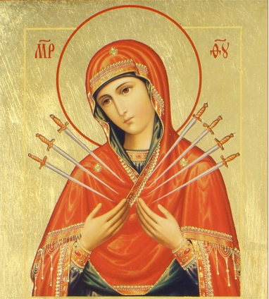 Более древние варианты изображали Богородицу в полный рост, стоящей на облаке. Иногда мечи пронзают сердце Матери, сидящей возле тела распятого Господа. Но для православия подобные надрывные сцены крайне нехарактерны.