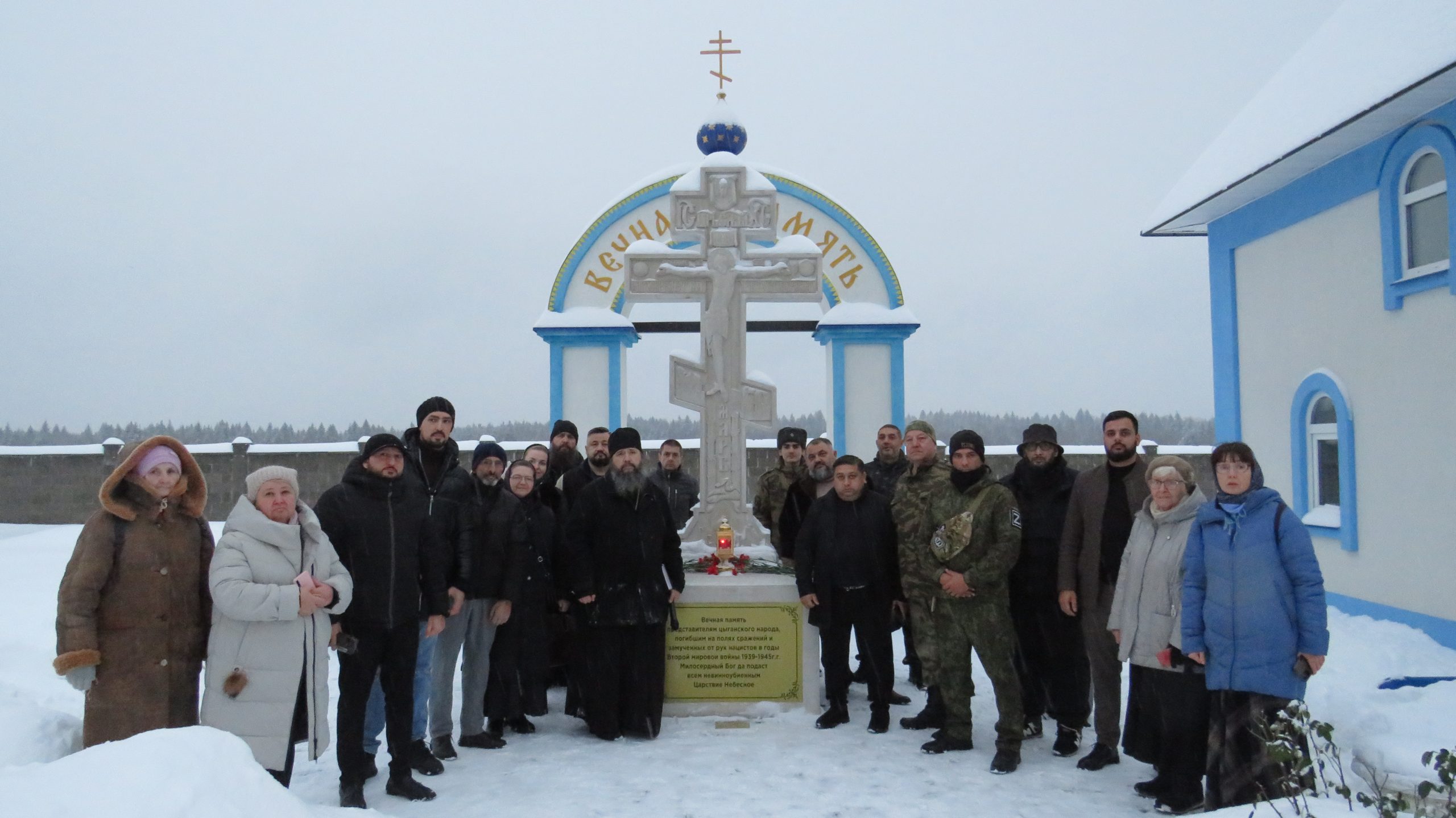 По завершении мероприятий в помещении храма, участники встречи проследовали к поклонному кресту, где почтили минутой молчания память всех цыган, погибших на полях сражений, а также замученных в концлагерях. После возложения цветов к подножию креста, игумен Феофан вручил гостям подарки и обсудил планы дальнейшего взаимодействия, в том числе вопросы духовно просветительской работы с цыганскими семьями.