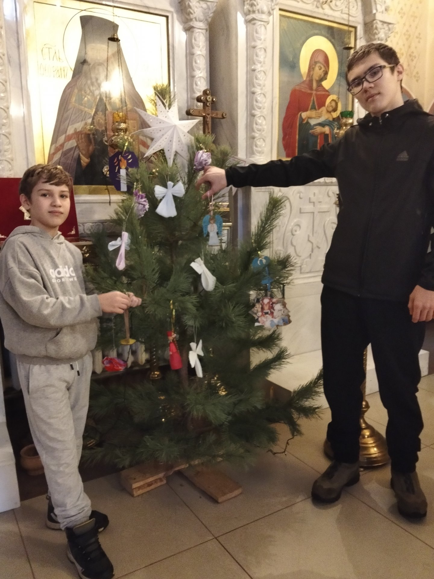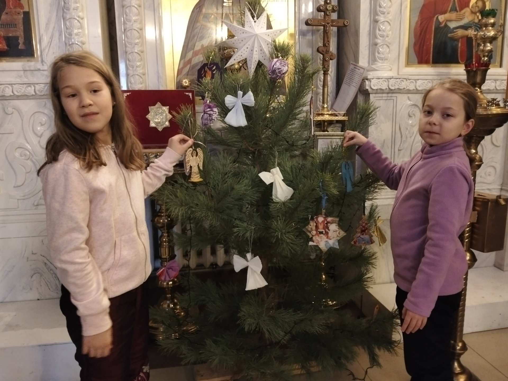 На занятиях в Рождественский пост дети заранее мастерили поделки для украшения ёлочек. И две чудесные ёлочки уже стоят в храме,украшенные детскими руками.