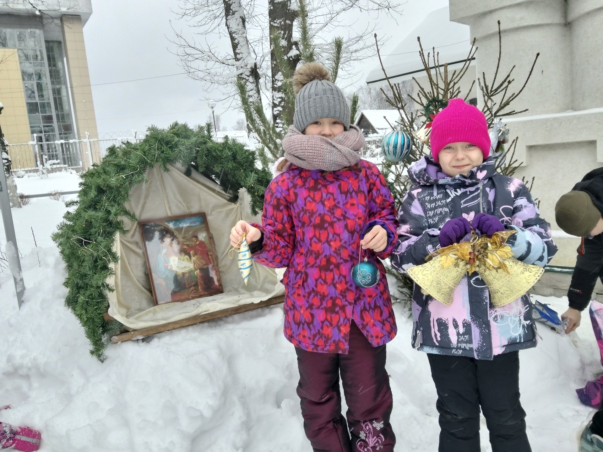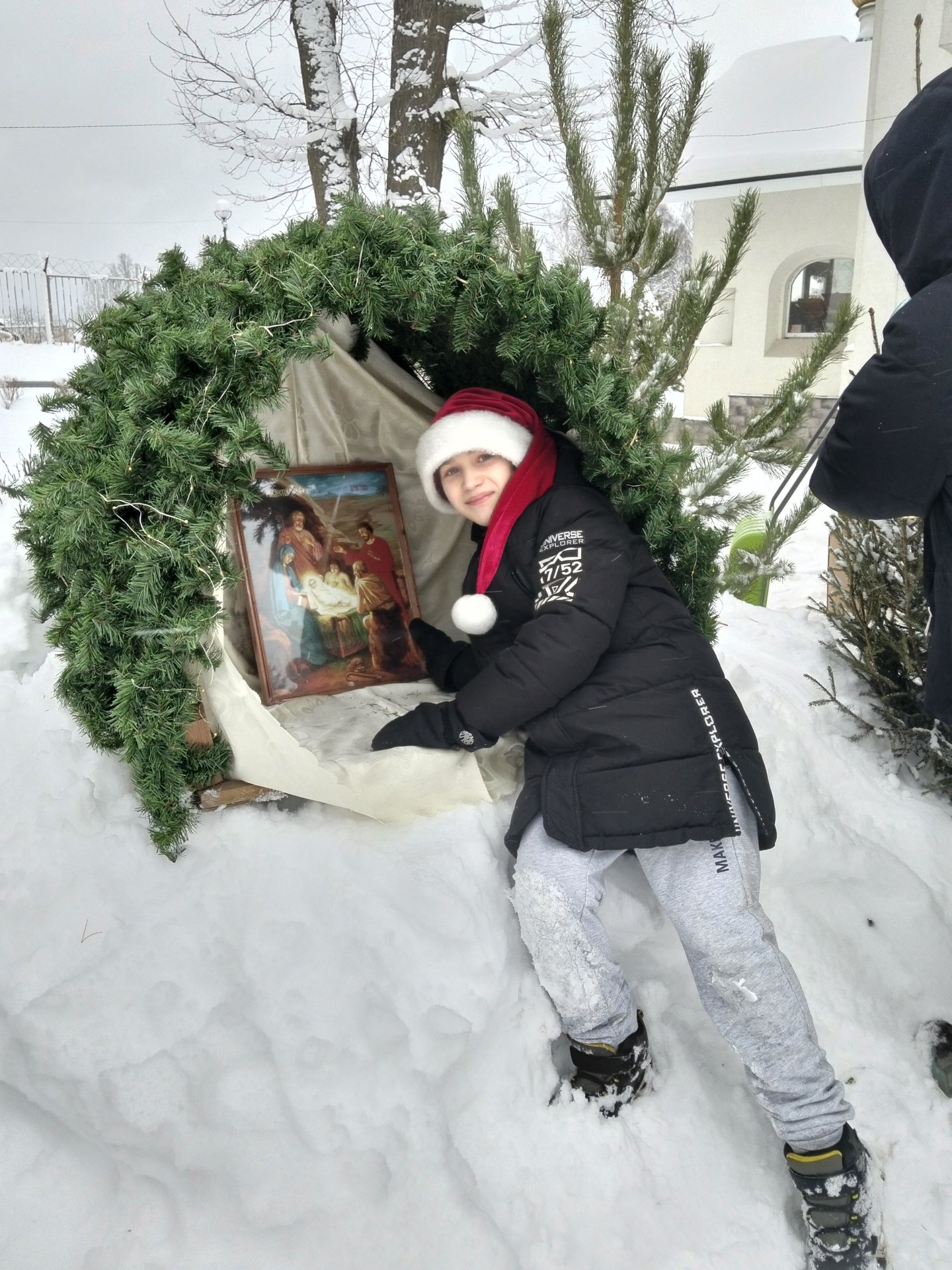 Возле храма установлен вертеп — традиционное рождественское убранство, изображающее сцену рождения Иисуса Христа в Вифлееме.