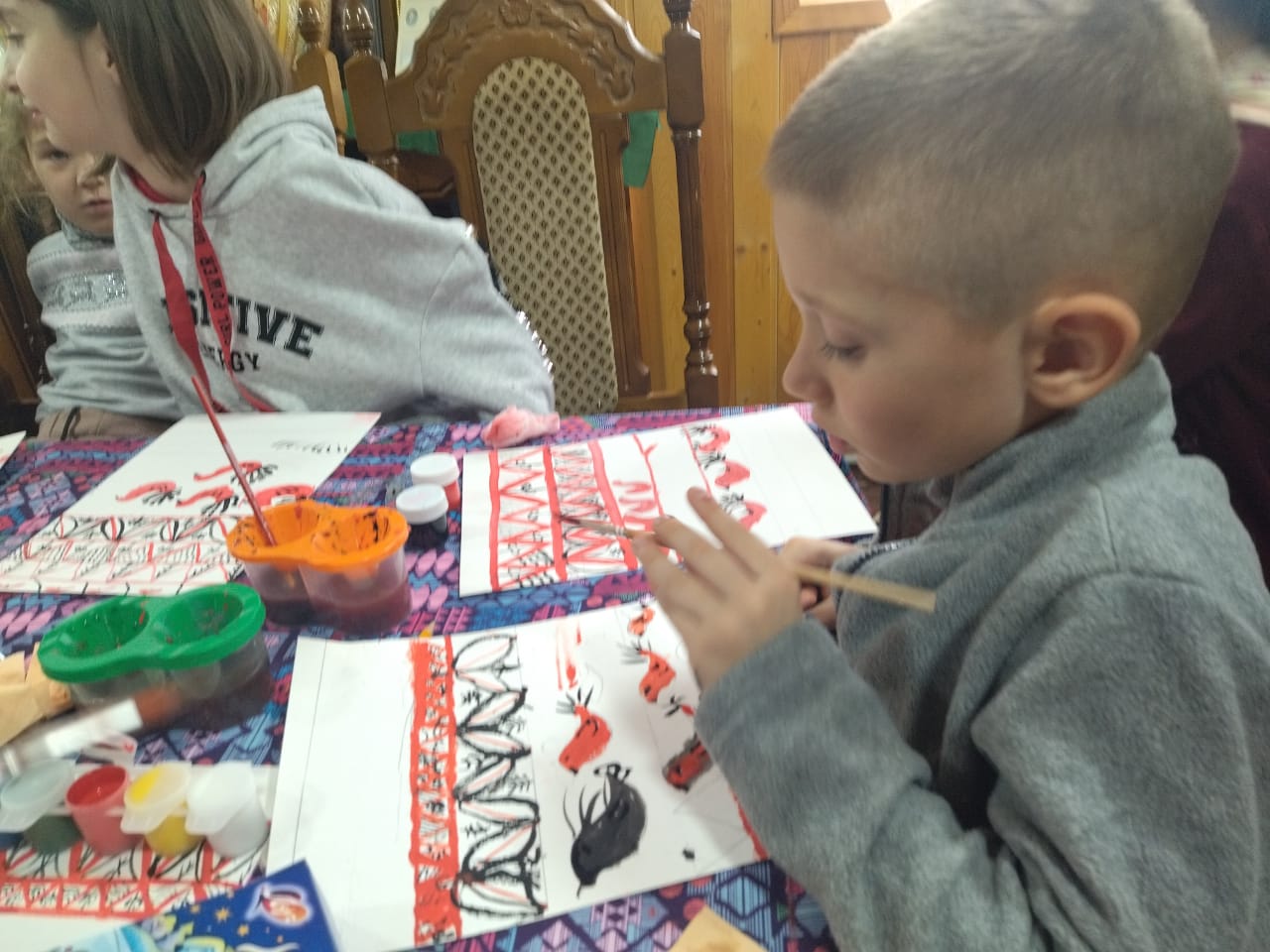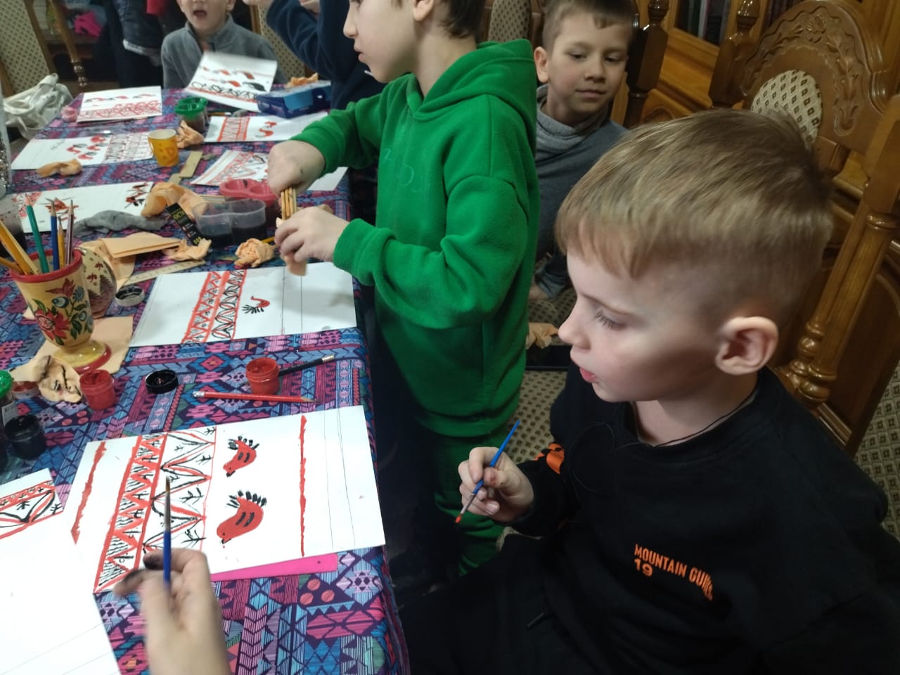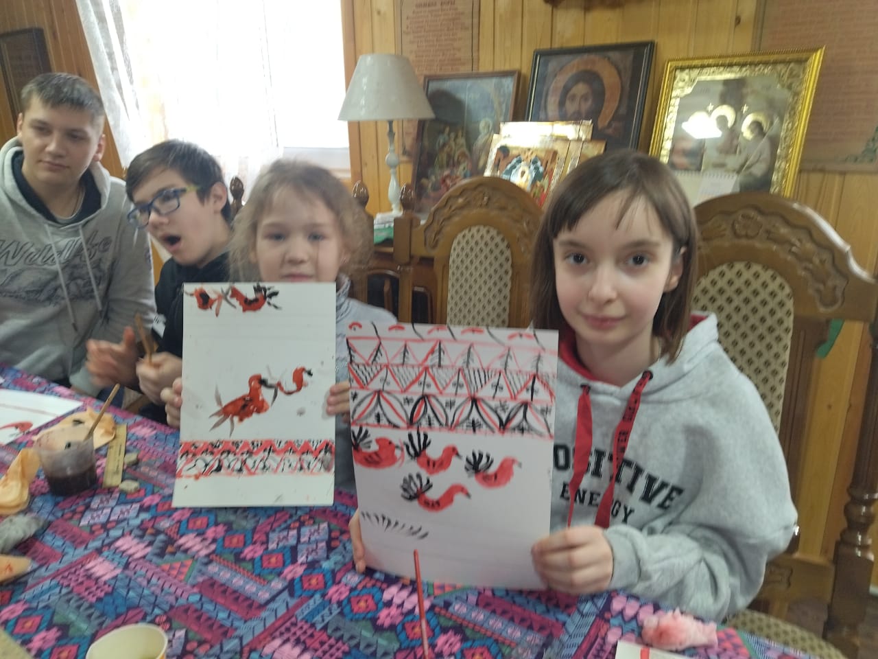 На уроке Закона Божьего раскрыои смысл понятия «двунадесятые праздники»; вспомнили главные христианские двунадесятые праздники: учились ,,читать,, и различать иконы двунадесятых праздников. Познакомились с евангельским повествованием о Сретении Господа Симеоном Богоприимцем и праздником в честь этого события.На уроке Творчества начали знакомство с историей возникновения мезенской росписи и изучение ее элементов.