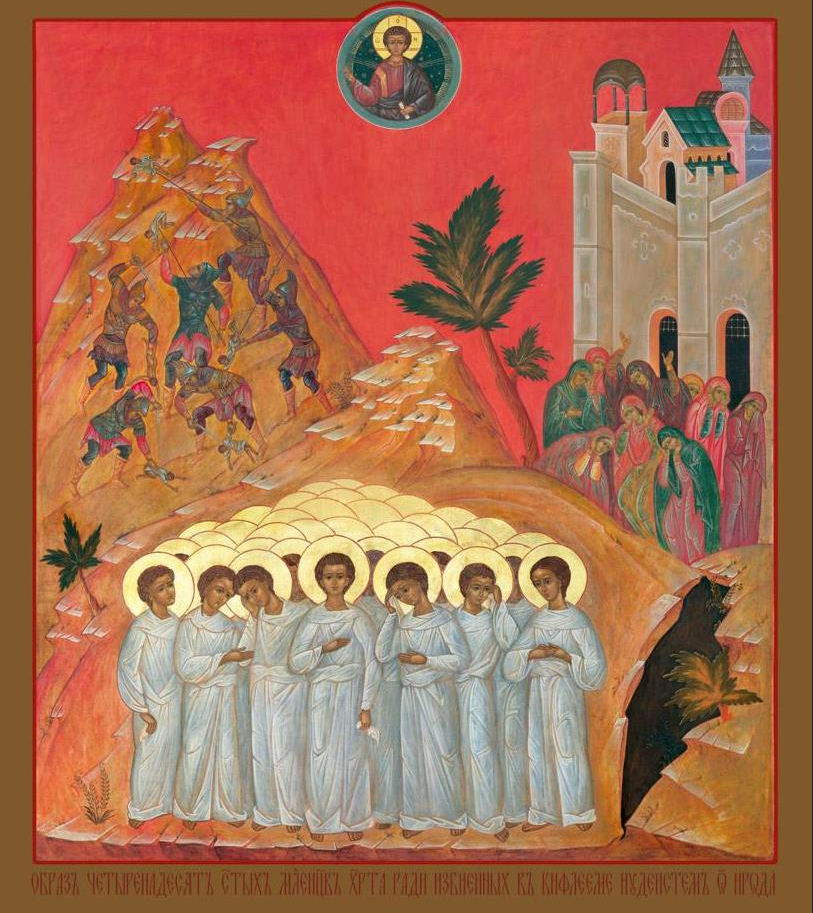 Святые мученики 14 000 младенцев убиты царем Иродом в Вифлееме. Когда пришло время совершения величайшего события – Воплощения Сына Божия и Рождения Его от Пресвятой Девы Марии, восточные волхвы увидели на небе новую звезду, предвозвещавшую рождение Царя Иудейского. Тотчас они направились в Иерусалим для поклонения Родившемуся, а звезда указывала им путь. Поклонившись Богомладенцу, они не вернулись в Иерусалим к Ироду, как он приказывал им, но, получив откровение свыше, ушли в свою страну иным путем. Тогда Ирод понял, что замысел его найти Младенца не осуществился, и приказал убить в Вифлееме и окрестностях всех детей мужского пола от двух лет и младше. Он рассчитывал, что среди убитых детей будет и Богомладенец, в Котором видел соперника. Погубленные младенцы стали первыми мучениками за Христа. Гнев Ирода обрушился и на Симеона Богоприимца, который всенародно свидетельствовал в храме о Родившемся Мессии. Когда святой старец скончался, Ирод не допустил, чтобы его достойно погребли. По повелению царя был убит святой пророк священник Захария: его умертвили в Иерусалимском храме между жертвенником и алтарем за то, что он не указал, где сын его, Иоанн, будущий Креститель Господа Иисуса Христа. Гнев Божий вскоре покарал самого Ирода: его постигла лютая болезнь, и он умер, заживо съеденный червями. Перед смертью нечестивый царь довершил меру своих злодеяний: убил первосвященников и книжников иудейских, родного брата, сестру и ее мужа, свою жену Мариамну и трех сыновей, а также 70 мудрейших мужей, членов Синедриона.